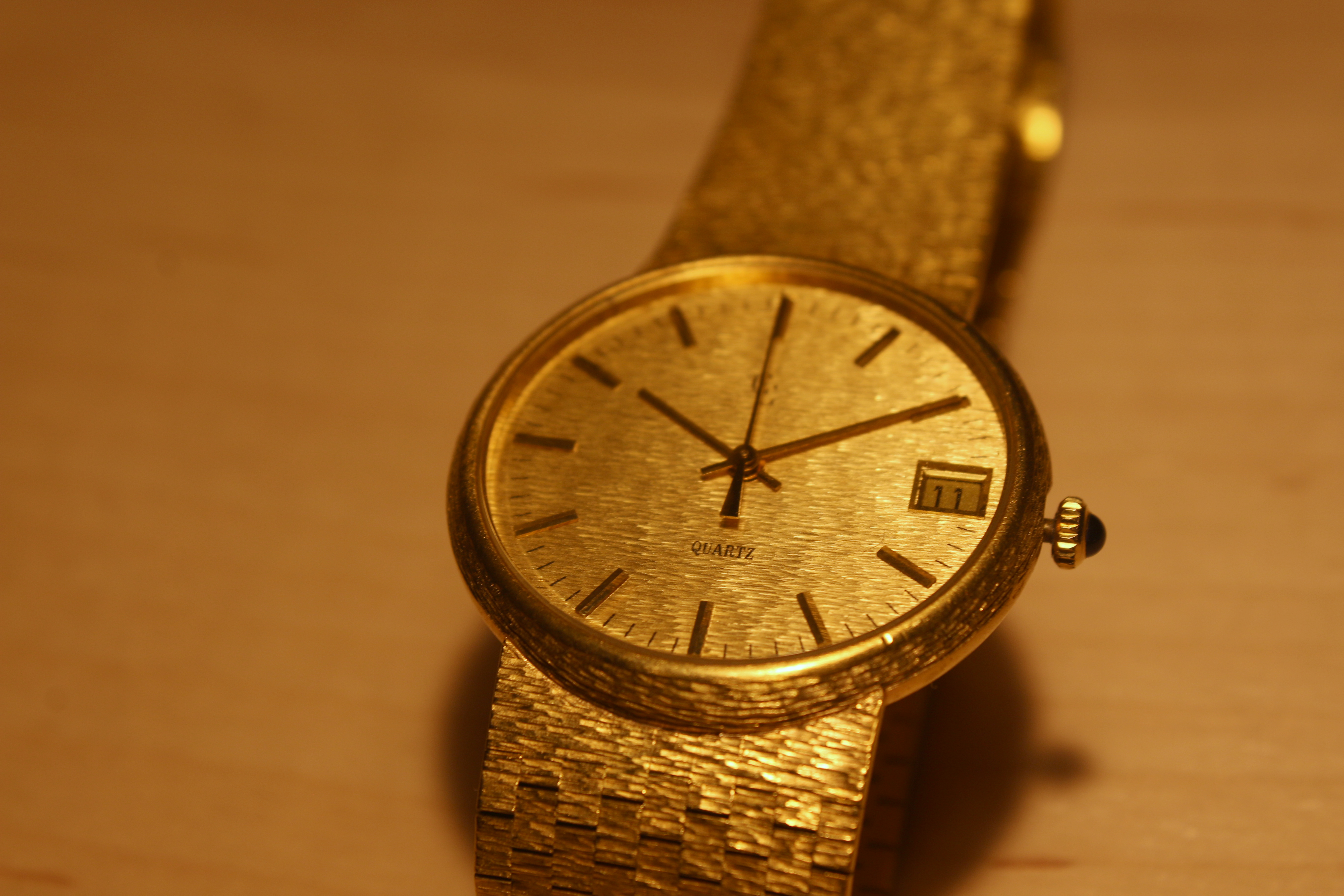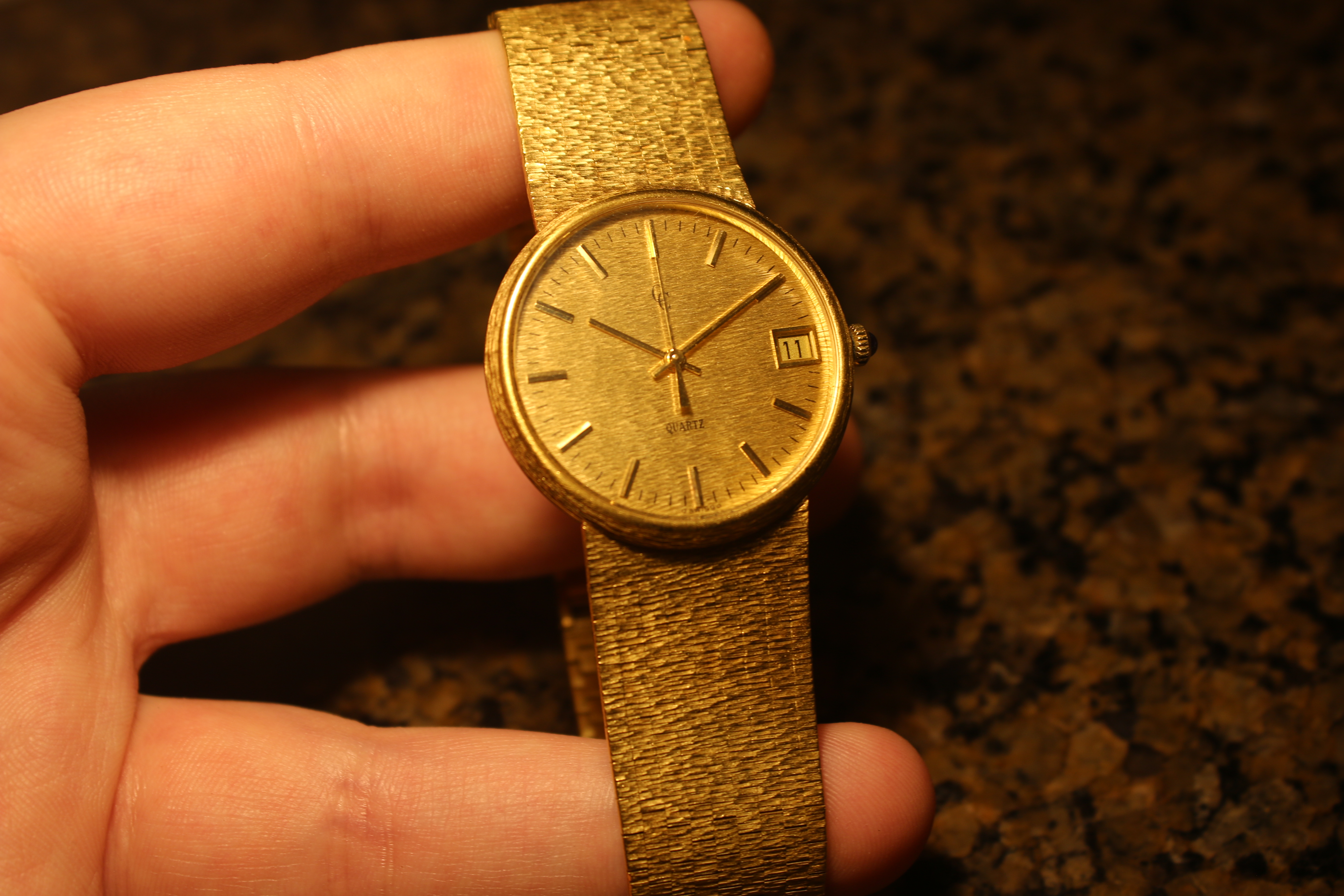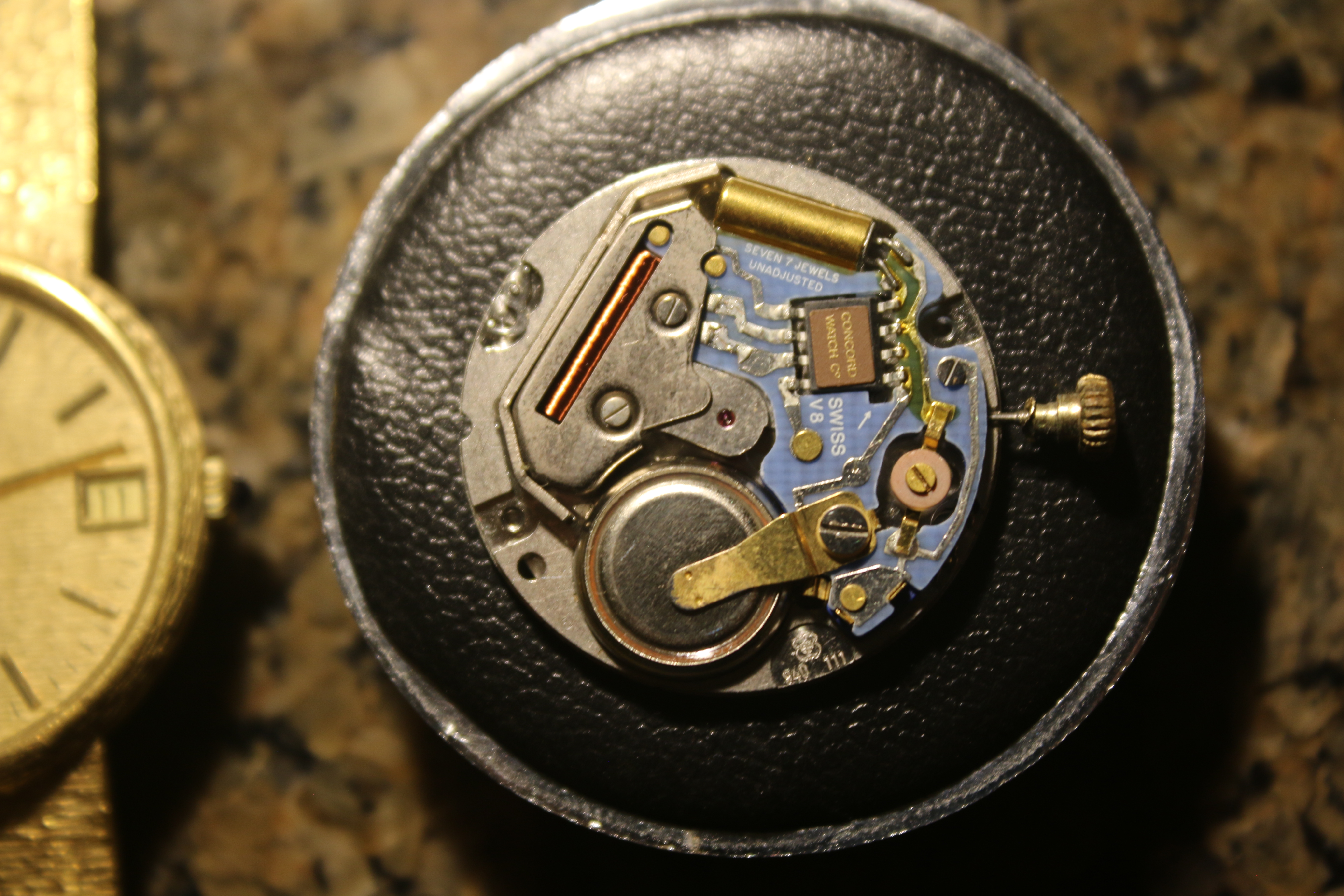 Last is an old Swiss quartz watch that my father inherited. It is from the very early days of Swiss companies embracing quartz movements, and as such it is difficult to find a replacement. Fortunately, the movement was manufactured by a very large Swiss manufacturer, so it's not impossible to find a replacement. I was able to source a replacement movement, it was expensive and was labeled as "working, but a service is recommended". Maybe at some point I will service it. There was one problem, though. The OEM date wheel was a gold-tone, to match the dial, and the replacement had a standard white date wheel. I had to swap them, which added quite a bit of complexity to the operation. Removing the date wheel from the movment consisted of removing 2 small plates, secured with tiny screws. In the end, I am quite satisfied with the result.