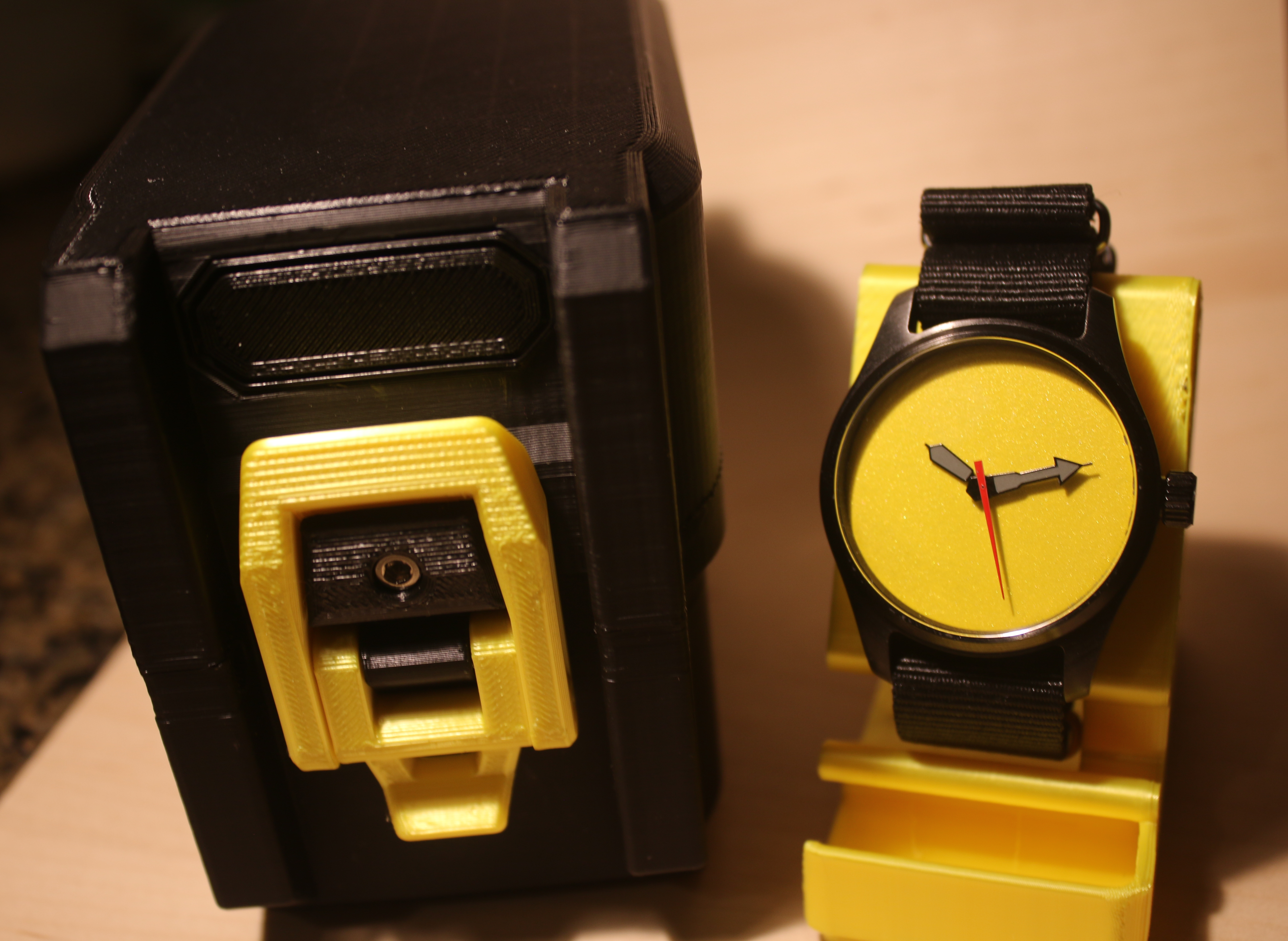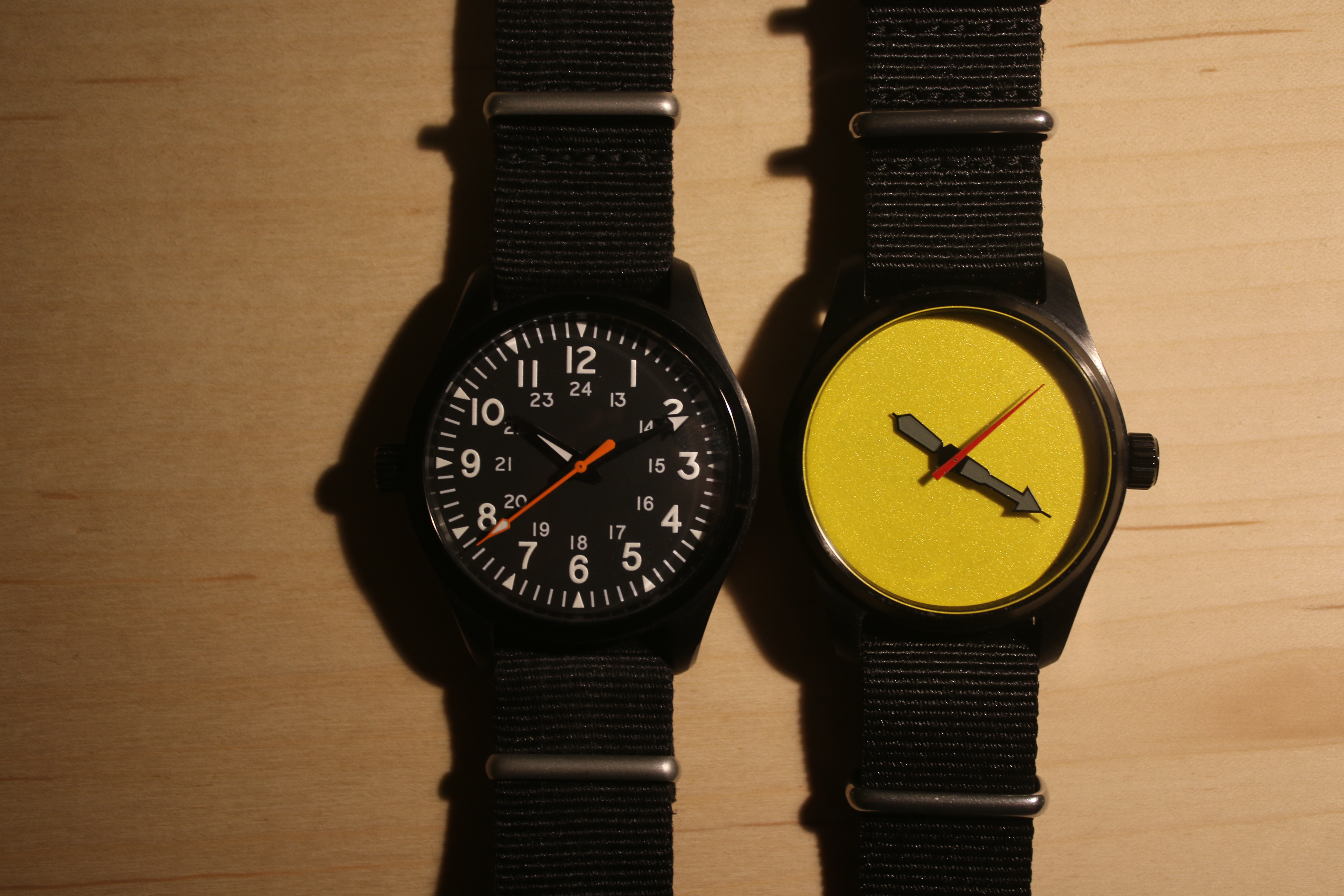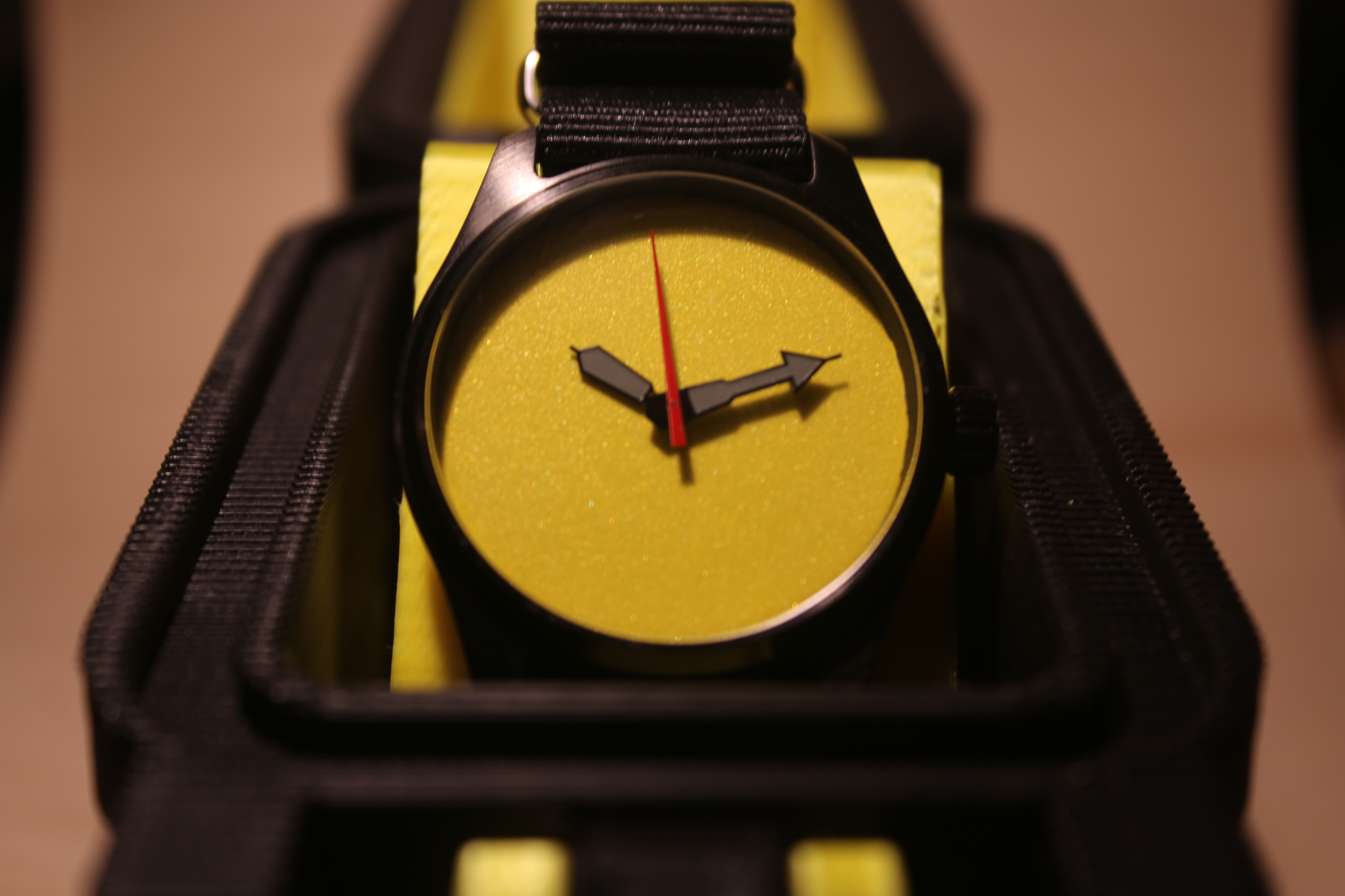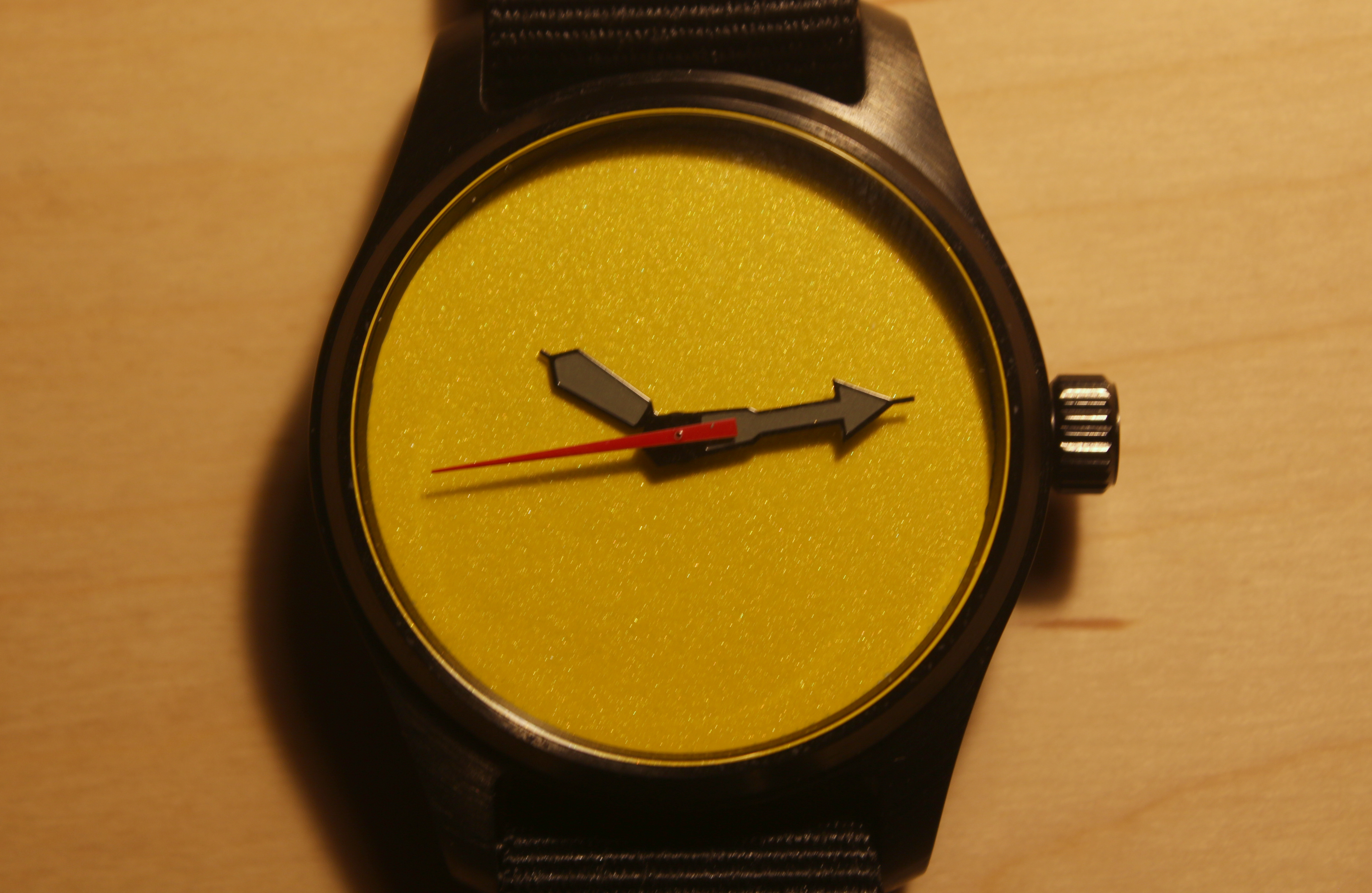 One thing you need to know about my father is that he likes his yellow car. He is very proud of it, as it is a cool car and the metallic yellow color is quite rare (and beautiful!). My idea for the perfect gift would be to build him a watch with a custom painted dial in the exact color of his car. I would do this by stripping the paint off of a flat dial I bought, and re-painting it with a touch-up paint kit I bought for the exact color of the car. It's a lot easier said than done, though; it is a rather complicated and precise 3-coat paint process, and I need to get everything perfect for it to turn out accurate. It took quite a while to get right, but when it was done it turned out amazing. I am proud of myself for this one!!! The hour and minute hands are recreations of the hands of his SKX, but with grey lume for a blacked-out look. The seconds hand is red and supposed to be reminiscent of a gauge in a car.