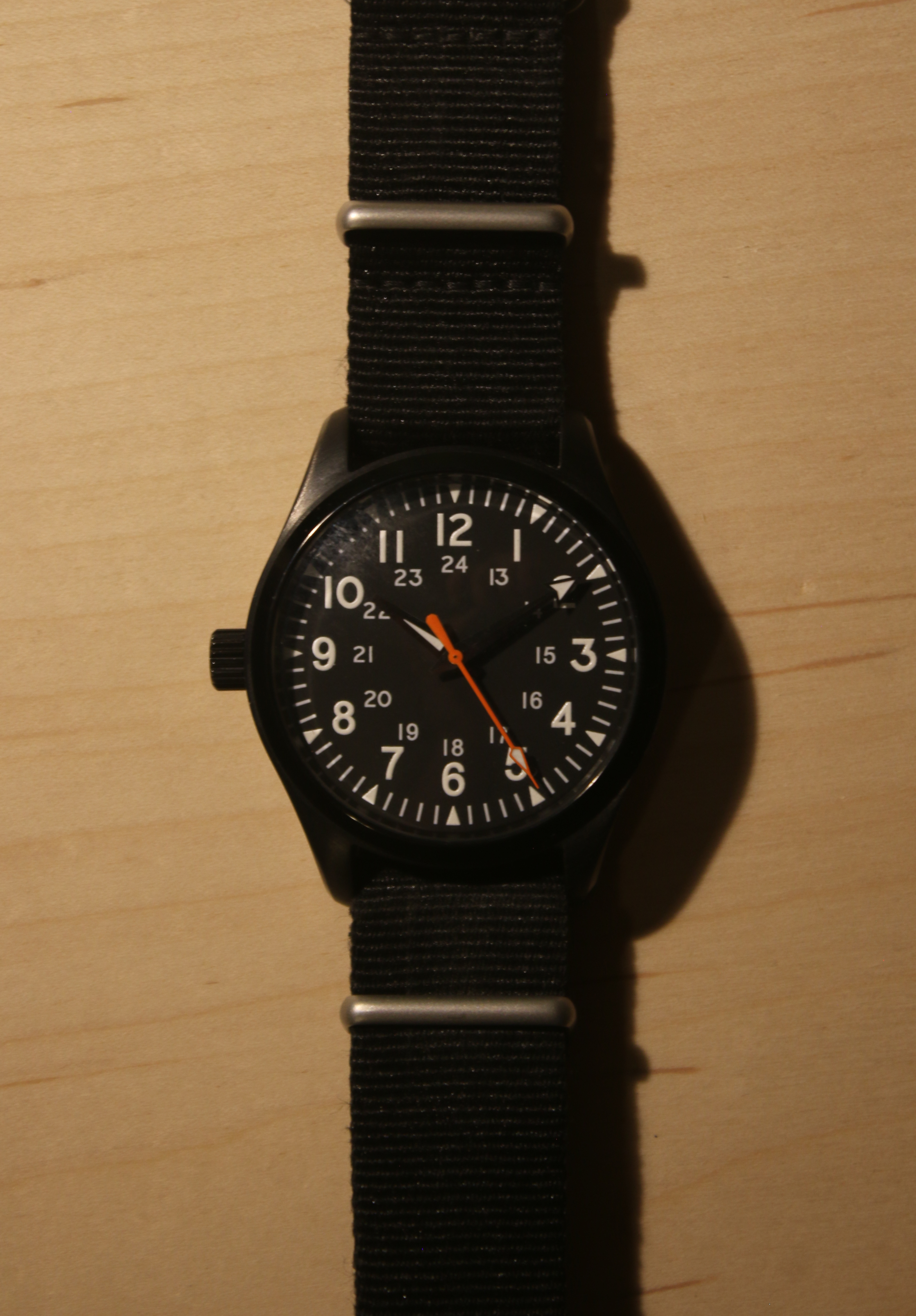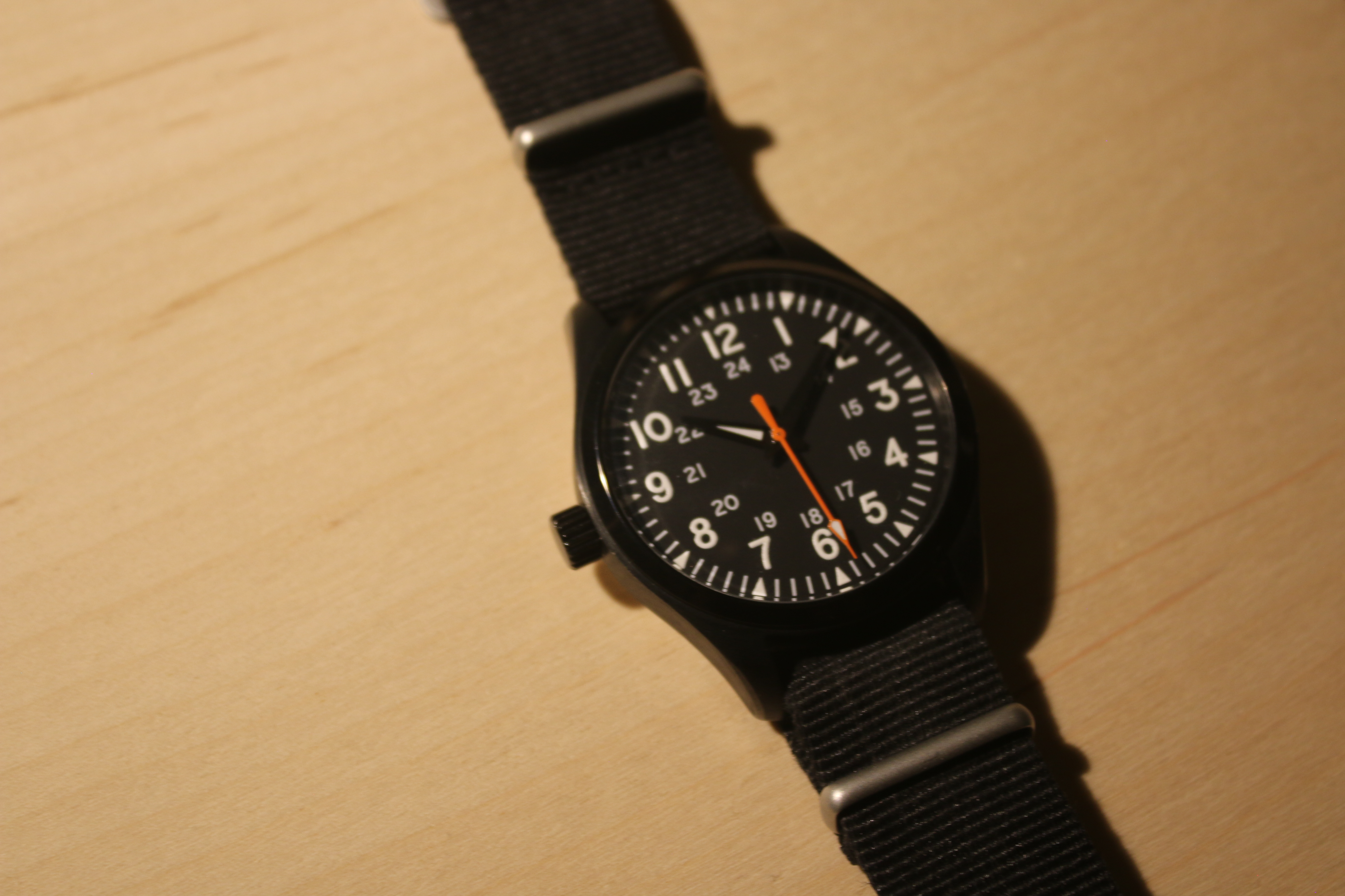 The watch I built for myself is not anything too remarkable, but it acted as a test and proof-of-concept for my main goal, which was the custom watch I made my father. The movement of both is a Seiko NH38, which is a simple 3-hander with no extra complications. It is in a 40mm field watch case, has a field watch dial and handset that I quite like the style of. Funny story, I later learned that these hands are a copy of the hands of the Omega Seamaster Aqua Terra. Small world! A nice feature of building your own watch is that the dials you buy generally have extra dial feet so that you can also put the dial upside-down, to create a left-handed watch.