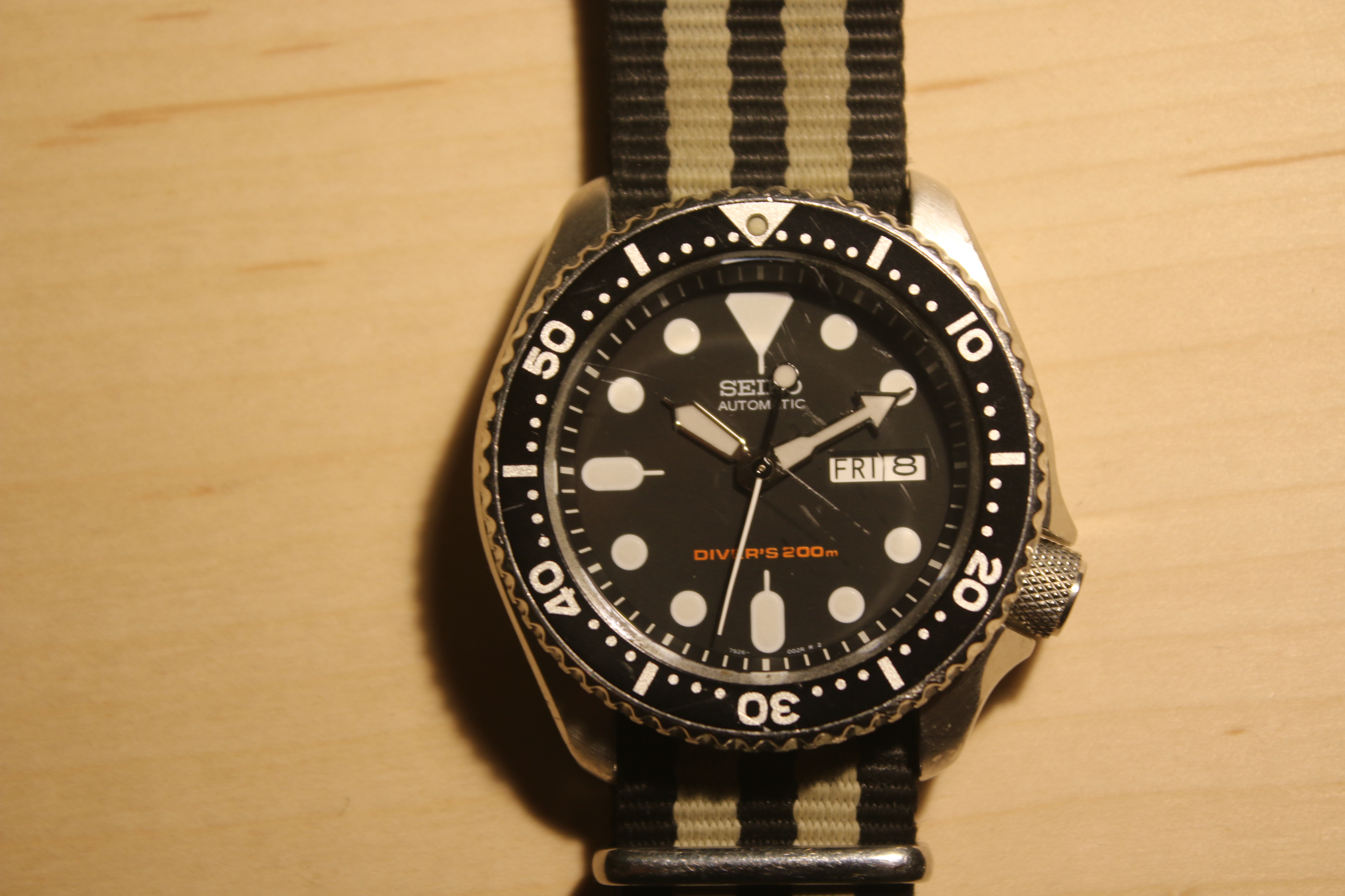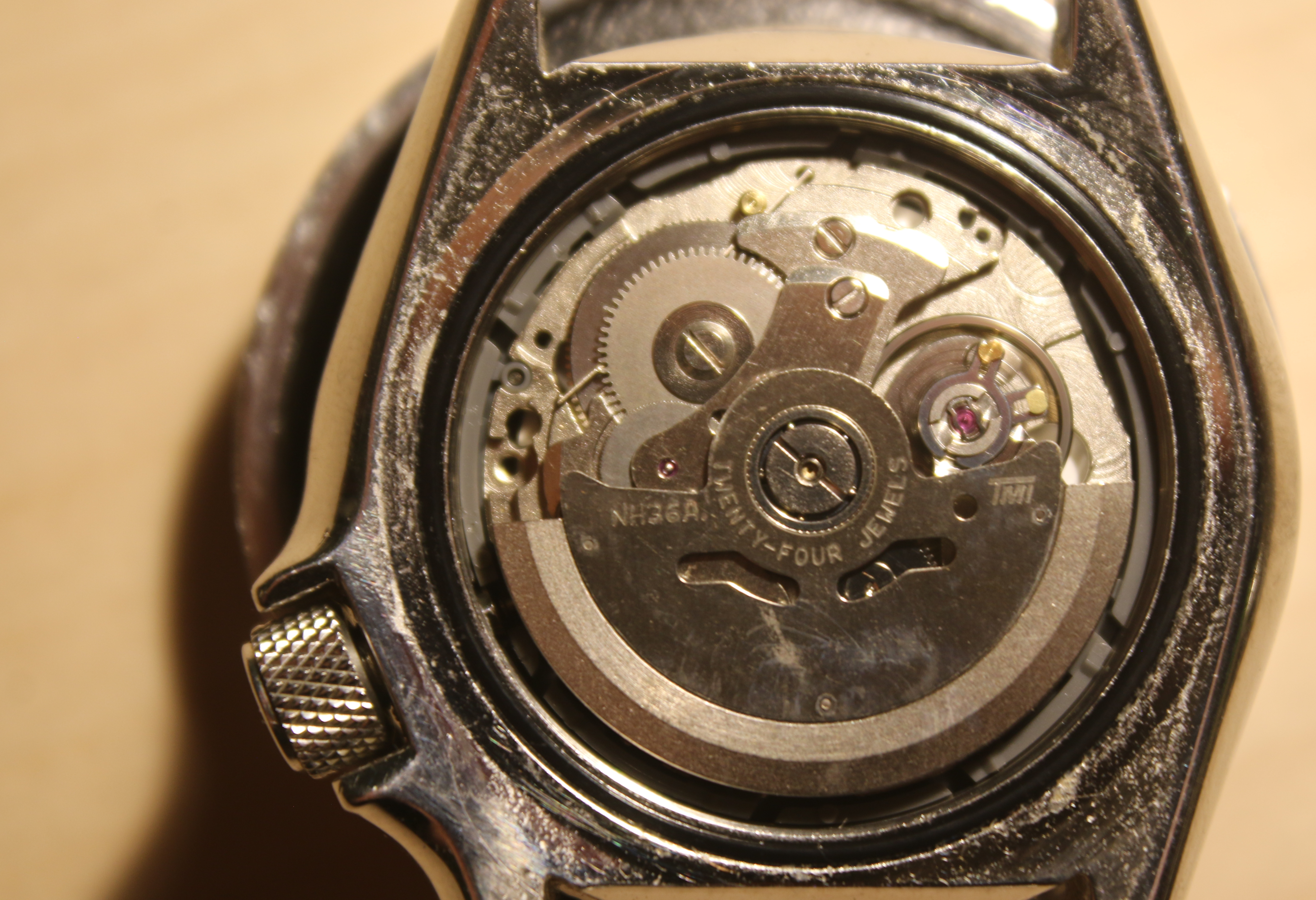 Next is a mechanical watch. The movement on my father's Seiko SKX started running extremely fast, to the point that even adjusting the balance wheel wasn't enough to fix it. After a couple failed attempts to regulate it, we decided to replace the older 7s26 movement with the more modern, more reliable, and cheaper Seiko NH36. Fortunately, they are completely drop-in compatible (except for the stem/crown), which simplified the process greatly.